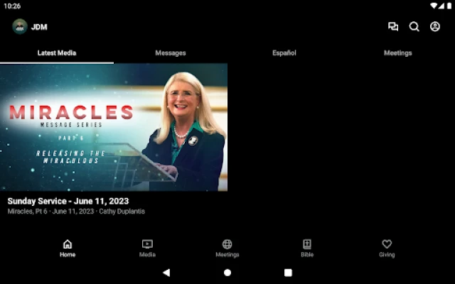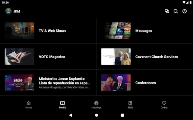 V rámci iniciativy JDM Spanish Outreach přináší Jesse Duplantis Ministries App speciální sekci vytvořenou exkluzivně pro španělsky mluvící publikum, zajišťující, že poselství víry je dostupné pro každého. Objevte plné spektrum zdrojů, které Jesse Duplantis Ministries poskytuje, vše pohodlně uspořádané v jediné aplikaci. Je to nástroj navržený tak, aby sloužil vašemu duchovnímu růstu a spojení s globální komunitou věřících, a to vše s jednoduchým a intuitivním uživatelským rozhraním.