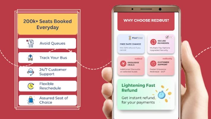 redBus jde nad rámec pouhé dopravy a nabízí rozsáhlou síť ubytování. Prozkoumejte tisíce hotelů, hostelů a ubytování v soukromí ve více než 2000 městech po celé Indii, s garantovanými nejlepšími nabídkami a ověřenými recenzemi zákazníků. Zažijte prvotřídní cestování s autobusy certifikovanými Primo, které slibují vysoké hodnocení, přátelský personál a přesnost. Rezervace je jednoduchá a rychlá, stačí jen tři kroky k zajištění vaší cesty. Zůstaňte v obraze díky propojení s chytrými hodinkami Wear OS, které vám poskytují aktuální informace o cestě a haptická upozornění. Objevte svět pohodlného a efektivního cestování s redBus – vaším komplexním řešením pro pohyb i ubytování.