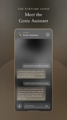 Pro maximální zážitek z vaší vůně je k dispozici Váš Asistent Genie, připravený 24/7 zodpovědět veškeré dotazy ohledně The Perfume Genie a zajistit bezproblémové používání. Uživatelsky přívětivé zapracování s vizuálním průvodcem a personalizačním krokem zajistí, že The Perfume Genie bude skutečně vaším osobním společníkem. Mějte přehled o stavu LED osvětlení, síťovém připojení a aktualizacích firmwaru přímo z aplikace. Nikdy vám neunikne důležitá informace díky upozorněním na docházející náplň nebo uvedení nových vůní. S rozšířenou jazykovou podporou, včetně tradiční a zjednodušené čínštiny, švédštiny a norštiny, se The Perfume Genie stává ještě přístupnějším pro globální komunitu Rituals.